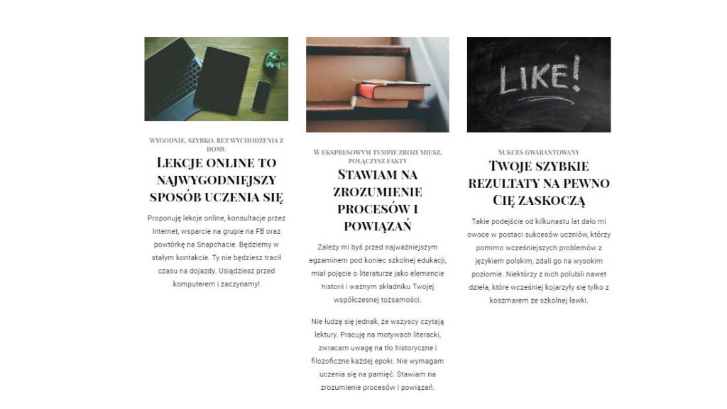 Proponuję lekcje online, konsultacje przez Internet, wsparcie na grupie na FB oraz powtórkę na Snapchacie.
