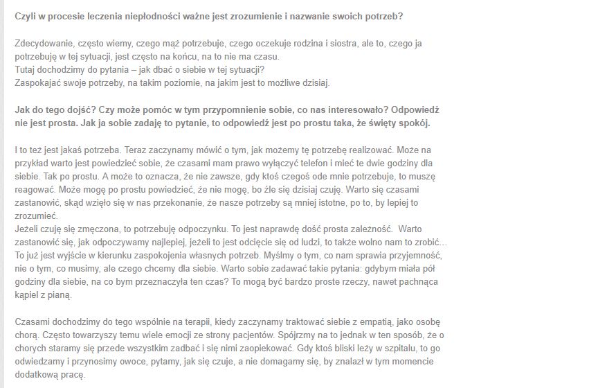 Edukowanie, tłumaczenie, mówienie o rzeczach trudnych jest obowiązkiem. Nie boję się mówić o takich sprawach, szczególnie dziś, gdy temat leczenia niepłodności jest tak szeroko komentowany w mediach, kościele, szkołach. Niestety nie zawsze w sposób zgodny z prawdą, często krzywdzący osoby leczące się. Niepłodność nie jest karą, nie powinna kojarzyć się ze wstydem. Jest chorobą, a choroby się leczy. Mam nadzieję, że ten wywiad zostanie puszczony w świat i przyczyni się do pomocy osobom pragnącym dziecka.